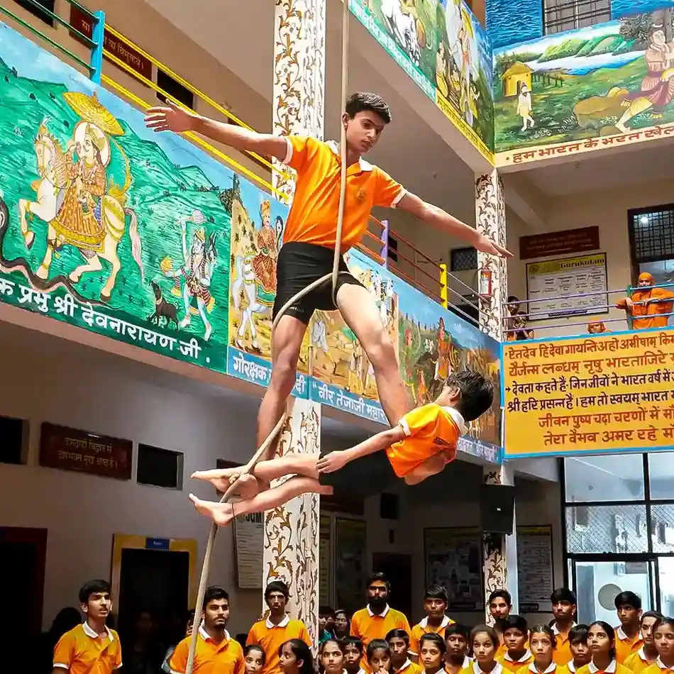 At our Gurukul, Malkhamb stands as a revered tradition, intertwining physical prowess with spiritual discipline. Each day, our students immerse themselves in the ancient art of Malkhamb, mastering its intricate techniques and embracing its profound philosophy. With dedicated practice, they ascend the wooden pole, executing breathtaking acrobatics and poses with grace and agility. Beyond physical strength, Malkhamb fosters mental focus, balance, and inner harmony. Through daily Malkhamb practice, our students embody the essence of resilience, discipline, and self-mastery, enriching their journey of holistic development.